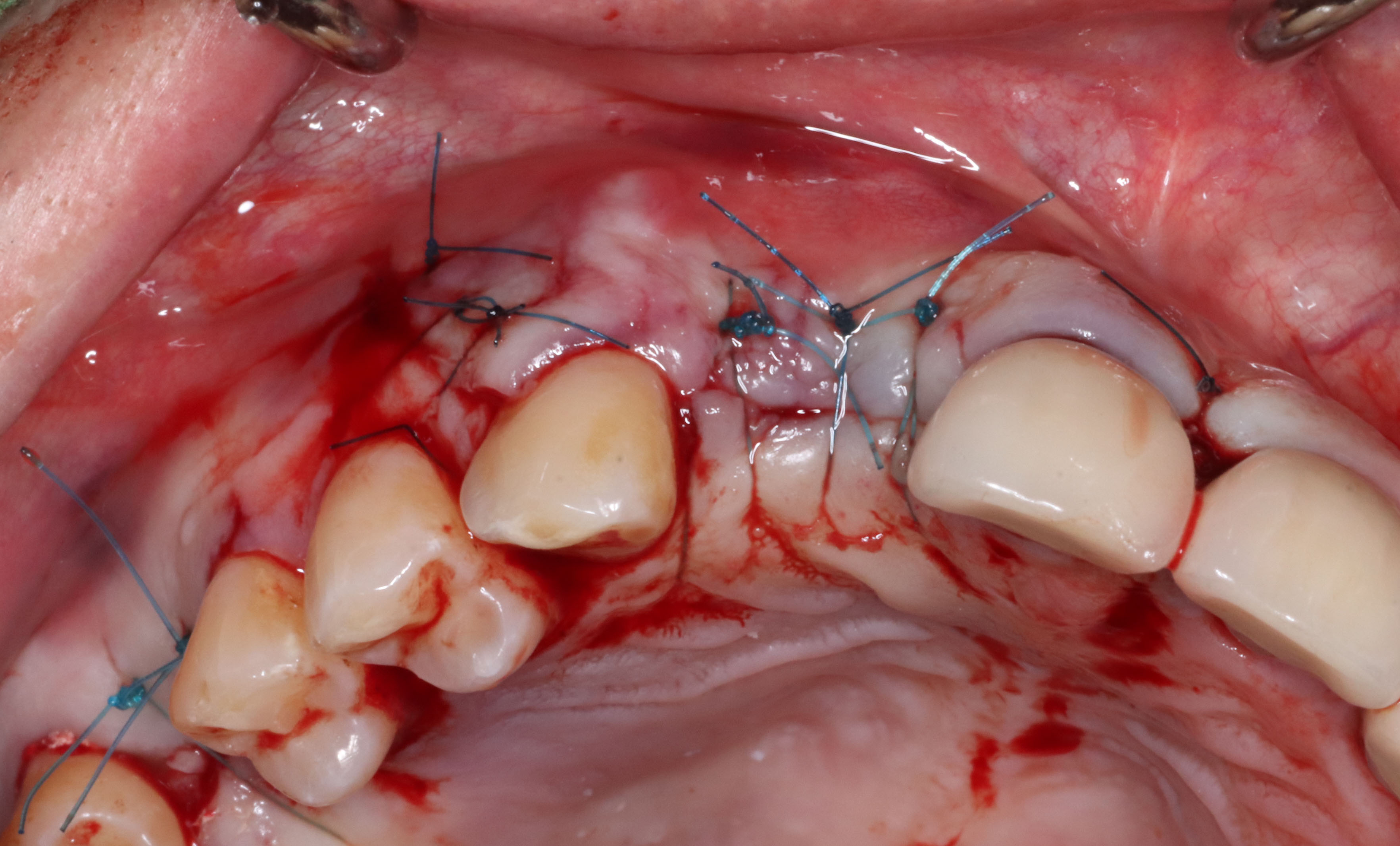 After placing a healing abutment, bone grafting was performed around it, and the area was sutured in a coronal direction.