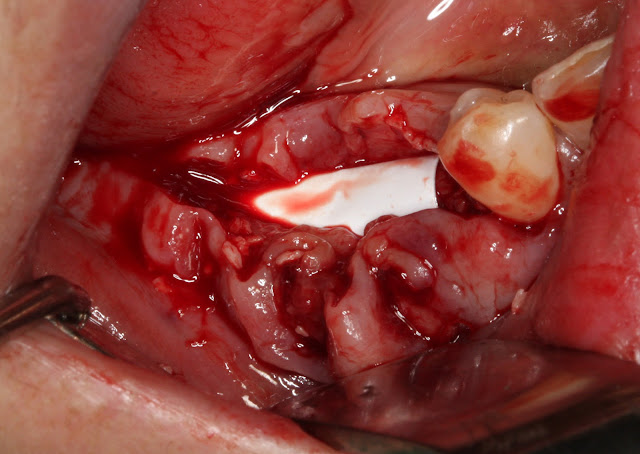 After thoroughly removing the infected tissue in the lower jaw, homogenous bone graft was performed, followed by placement of a non-absorbable membrane and suturing.